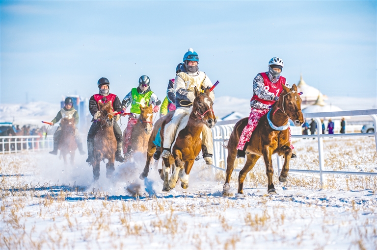 1月18日,錫林浩特市那達(dá)慕風(fēng)情園內(nèi)馬蹄踏雪、人聲鼎沸,“歌游內(nèi)蒙古·暢享錫林浩特”——冬季那達(dá)慕暨蒙古馬超級聯(lián)賽在歡騰的歌聲中拉開序幕。開幕式上,隨著馬蹄的噠噠聲,一支雄壯的馬隊(duì)踏雪而來,騎手們身著艷麗的蒙古袍,駕馭著矯健的蒙古馬,以整齊的隊(duì)列自遠(yuǎn)處緩緩走來。歌聲悠揚(yáng),舞姿豪邁,演員們以動人的演繹,完美詮釋了力量與藝術(shù)之美。本次賽事包含15公里耐力賽、10公里3人團(tuán)體接力賽、跑馬射箭、跑馬拾哈達(dá)、6公里走馬及搏克比賽等比賽項(xiàng)目。賽場上,騎手們馭馬飛馳,人與馬默契配合,在銀裝素裹的雪原上縱橫馳騁。在跑馬射箭與跑馬拾哈達(dá)項(xiàng)目上,騎手在飛奔的馬匹上挽弓搭箭、俯身拾物,動作行云流水,精湛技藝引來觀眾陣陣驚呼與贊嘆。除了扣人心弦的比賽,本次活動還為游客打造了豐富的冰雪互動體驗(yàn)。冰雪涮肉宴香氣四溢,草原篝火電音派對將熱情推向高潮,千人雪戰(zhàn)、雪地拔河等趣味項(xiàng)目讓游客親身參與,盡情享受冰雪樂趣。現(xiàn)場還同步舉辦了錫林浩特“伊德喜”草原冬儲肉展銷活動,讓游客在觀賽之余,還能選購到正宗錫林郭勒牛羊肉,體驗(yàn)純正的草原風(fēng)味。(記者