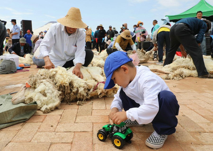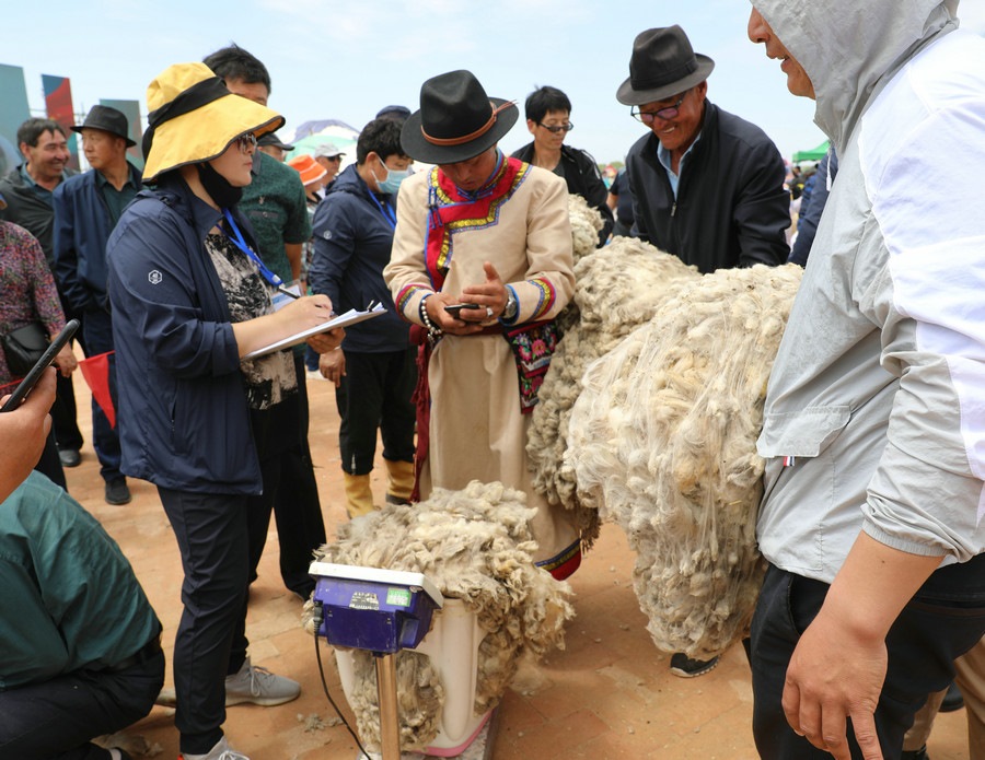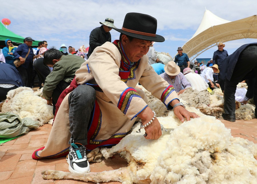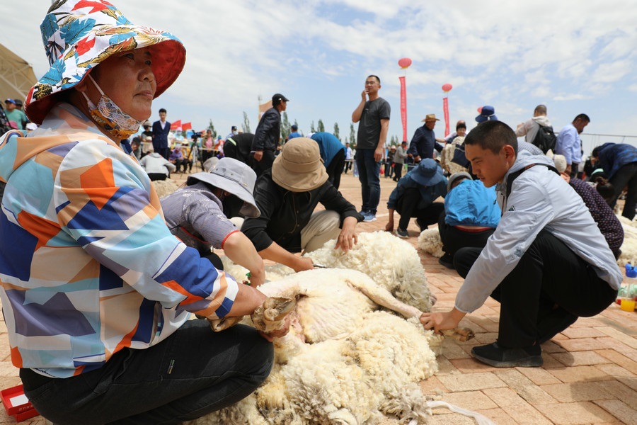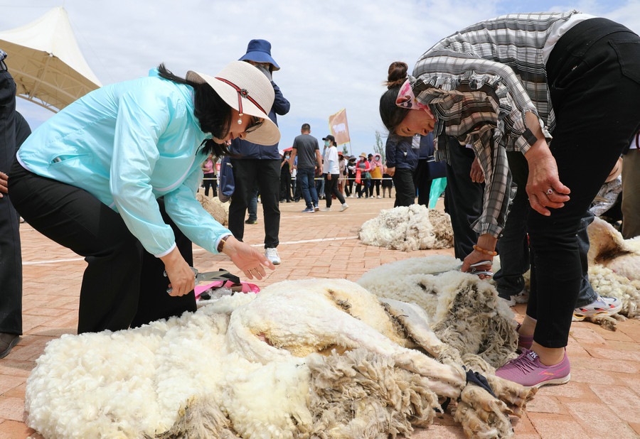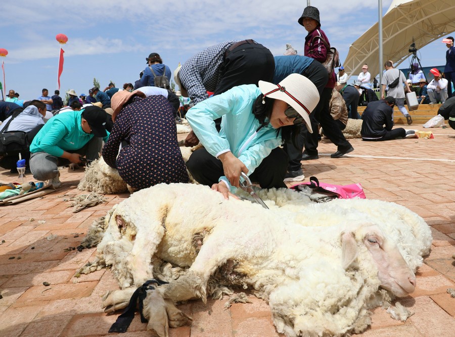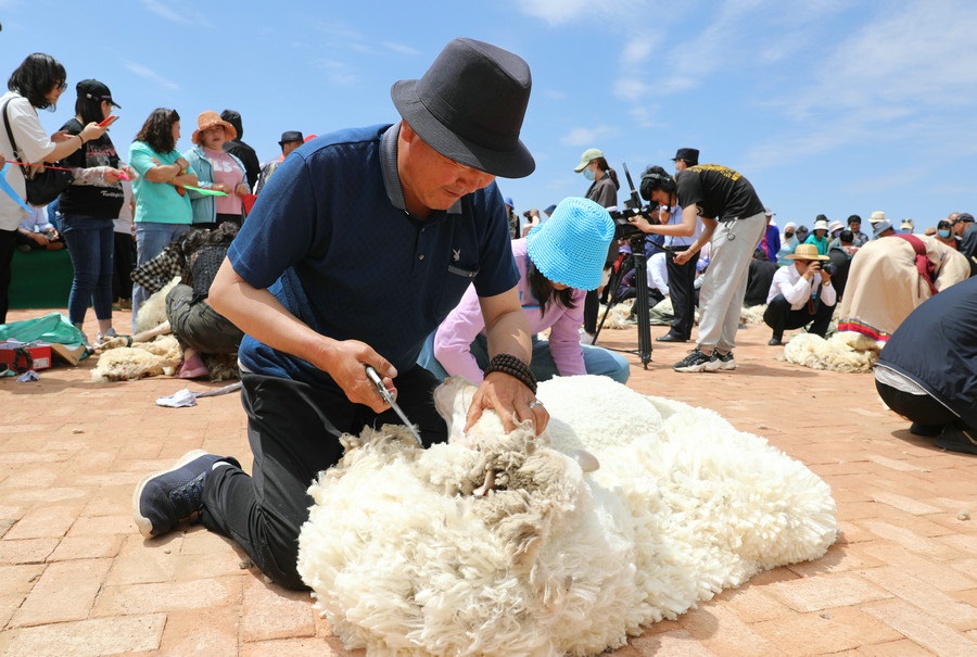 在同步舉行的剪羊毛大賽中,參賽選手們用剪刀和電動剪毛機(jī),在細(xì)毛羊身上翻飛操作,牧民們熟練的身手和精湛的技藝,使一只只羊片刻之間“脫胎換骨”。