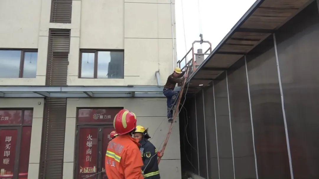 指揮員立即命令第一營救小組前往建筑內(nèi)部,試圖通過住戶窗戶進(jìn)行營救,當(dāng)營救小組到達(dá)指定位置后發(fā)現(xiàn),消防隊員與被困工人相距太遠(yuǎn),空中營救的危險性和困難程度較高。消防隊員通過與被困工人交流,提醒他抓好繩索,安撫他的情緒。很快,第二組營救的消防隊員利用掛鉤梯爬到二層位置把纏繞的鋼絲繩拉到地面,4人分別拽一根鋼絲繩,松解纏繞的鋼絲繩,使升降機(jī)恢復(fù)運(yùn)行。而此時,天氣逐漸放晴,風(fēng)力也開始減弱,在消防隊員們的努力下,升降機(jī)緩緩下降,18時12分,被困的工人安全降落到地面。
