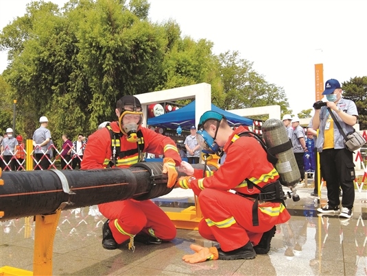 陣陣白煙模擬的是道路中壓燃氣管道泄漏,接到報警后,119消防指揮中心第一時間通過應急聯(lián)絡系統(tǒng)通知住建部門和燃氣企業(yè)到場處置,同時消防救援力量到達現(xiàn)場對泄漏點進行處置。接到通知后,中浩燃氣公司搶修及應急處置人員到達現(xiàn)場,對泄漏區(qū)域20米范圍內進行圍擋警戒,并攜帶可燃氣體檢測儀對周邊環(huán)境進行檢測,以防人員受傷,保證作業(yè)安全。應急處置人員佩戴空氣呼吸器進入現(xiàn)場,確定漏點及管道尺寸,用膠帶對漏點進行臨時處理,加裝管道抱卡,臨時封堵管道?,F(xiàn)場指揮人員根據(jù)處置情況,集結隊伍,利用運行不停輸維修設備進行管道維修。這一連串的操作下來,泄漏點被及時修好。負責此次演練的內蒙古中浩燃氣有限公司總經理賈鵬程介紹,這套不停輸管道維修設備,既節(jié)約了成本,又能保證安全供氣,能更好地服務保障廣大市民群眾。
