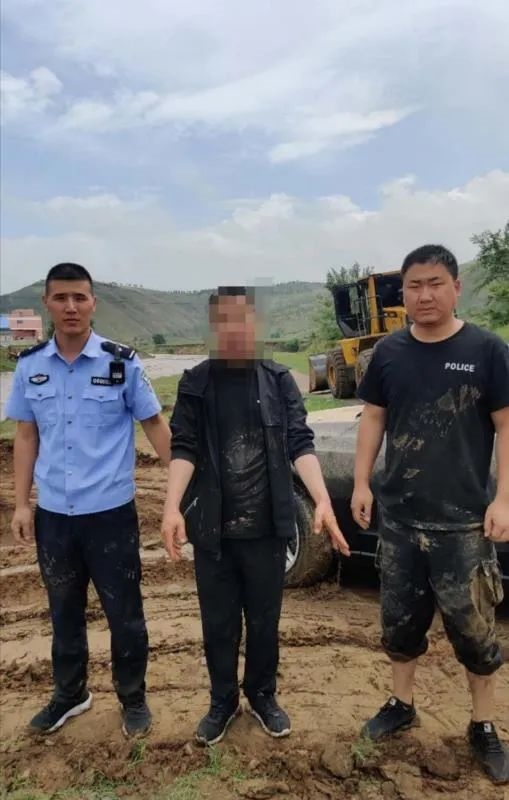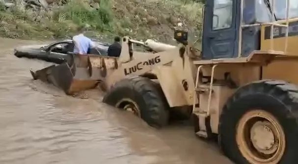 洪水還在上漲,經(jīng)研判分析,洪水仍在可控范圍內(nèi),為減少損失,兩位民警再次冒著生命危險(xiǎn),同裝載機(jī)一同下水,用繩索系牢越野車,將被困越野車拖上岸邊。