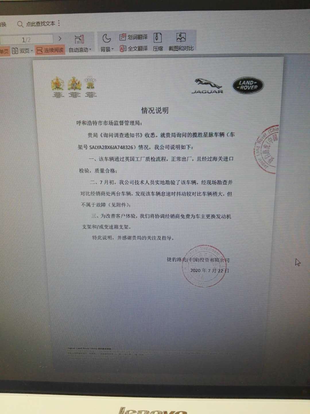 在多個車輛專區(qū)的貼吧里,均有關(guān)于該車型抖動,共振的情況反映。2019年,杭州30多名路虎星脈車主因?yàn)檐囕v共振導(dǎo)致耳鳴的問題,還共同趕到路虎上??偛考w維權(quán)。此事經(jīng)杭州媒體全程曝光,引起廣泛關(guān)注。盡管如此,捷豹路虎(中國)投資有限公司給出的答復(fù)和此次給呼和浩特市市場監(jiān)督管理局的《情況說明》如出一轍,都表示非質(zhì)量問題。