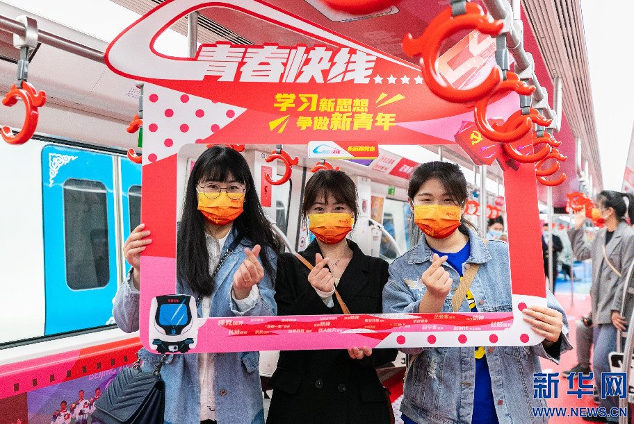 5月3日,呼和浩特市民在“青春快線”主題列車上留影。新華網(wǎng)發(fā)(丁根厚攝)