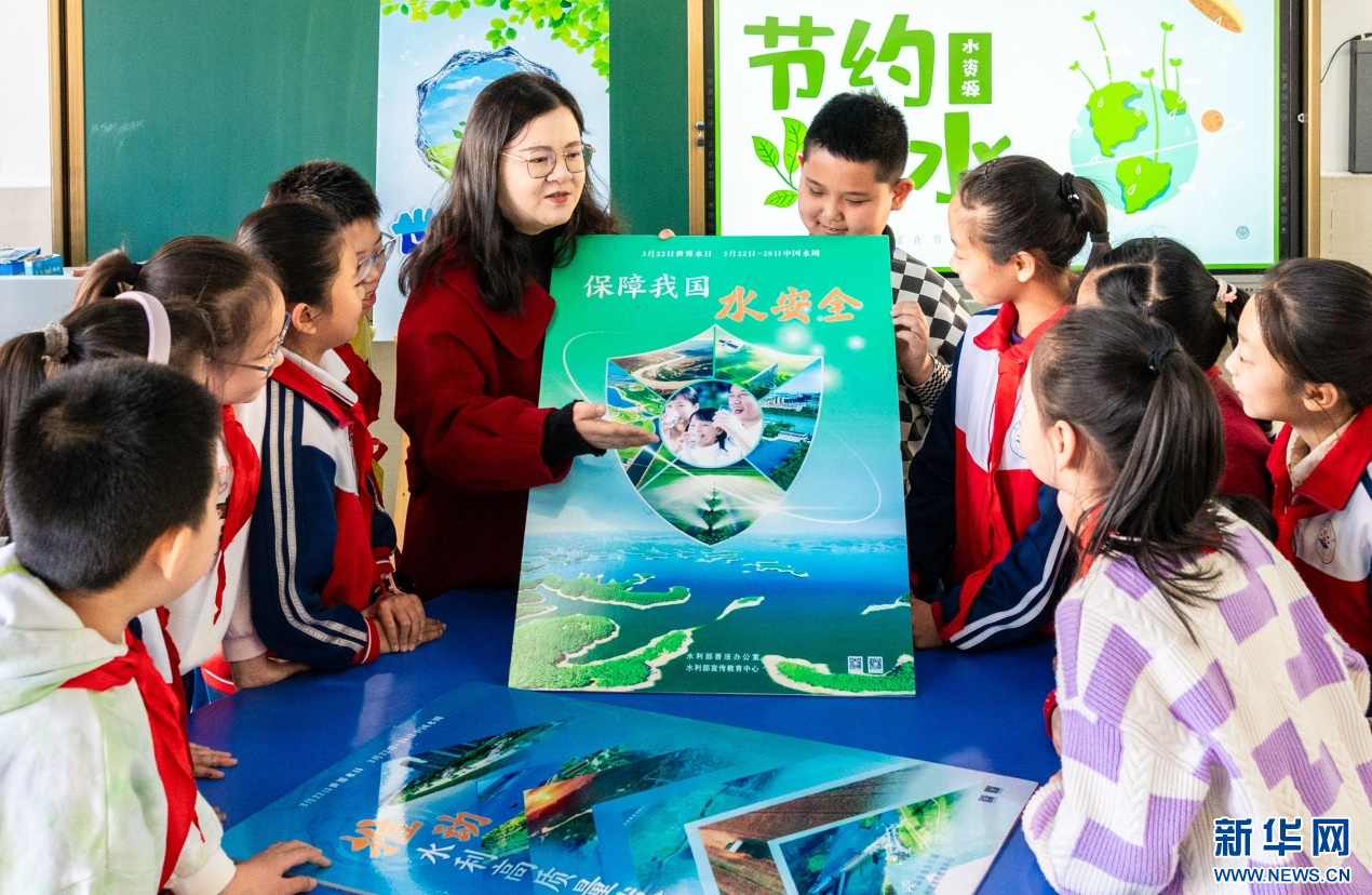 ??3月20日,呼和浩特市玉泉區(qū)石東路小學(xué)老師向?qū)W生們講解“保障我國(guó)水安全”等知識(shí)。新華網(wǎng)發(fā)(丁根厚 攝)