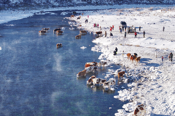 冬日的阿爾山國家森林公園不凍河,在陽光的照耀下輕盈的霧氣裊裊升起,悠閑的牛群在河中咀嚼著鮮美的水草。而那些露出水面的石頭,在寒冷的空氣中被霜花覆蓋如帽,毛茸茸、一團一團的霜花散落在水中。這如詩如畫的景象,吸引了眾多游客前來觀賞。他們紛紛駐足河岸,拿出相機和手機,競相捕捉稍縱即逝的美好瞬間。(記者 畢力格 攝)