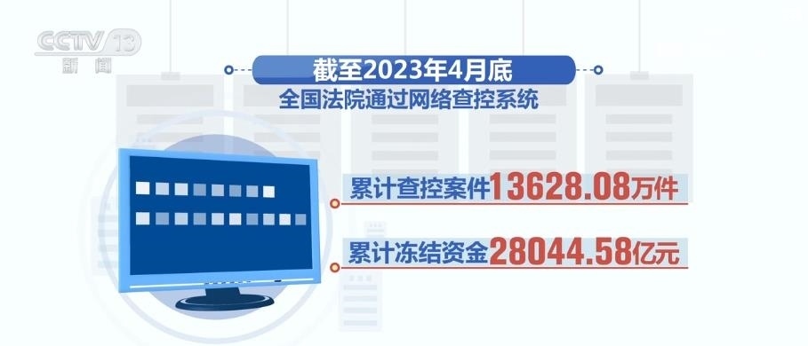 截至2023年4月底,全國法院通過網(wǎng)絡(luò)查控系統(tǒng)累計查控案件13628.08萬件,累計凍結(jié)資金28044.58億元,查詢房屋、土地等不動產(chǎn)信息81963.89萬條,車輛19018.00萬輛,證券42195.43億股,漁船和船舶371.79萬艘,網(wǎng)絡(luò)資金1009.75億元,有力維護(hù)了勝訴當(dāng)事人合法權(quán)益。