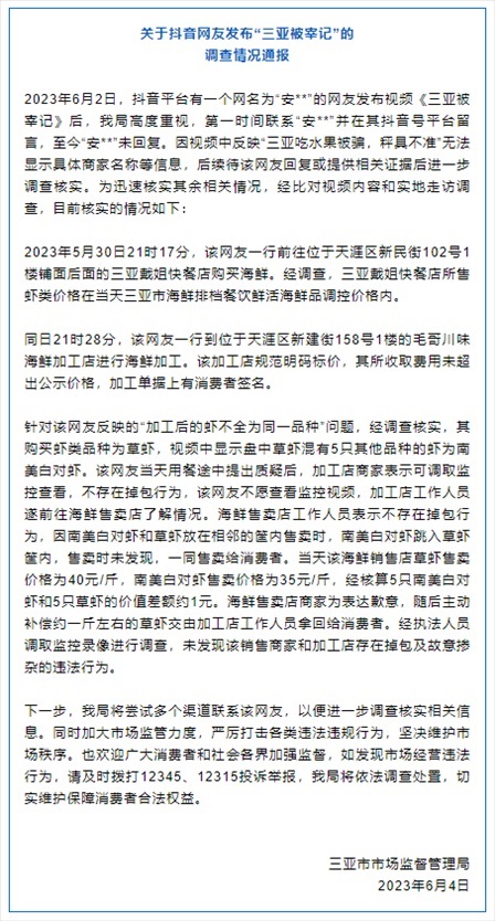 ·網(wǎng)友發(fā)布“三亞被宰記”,三亞通報調(diào)查情況。
