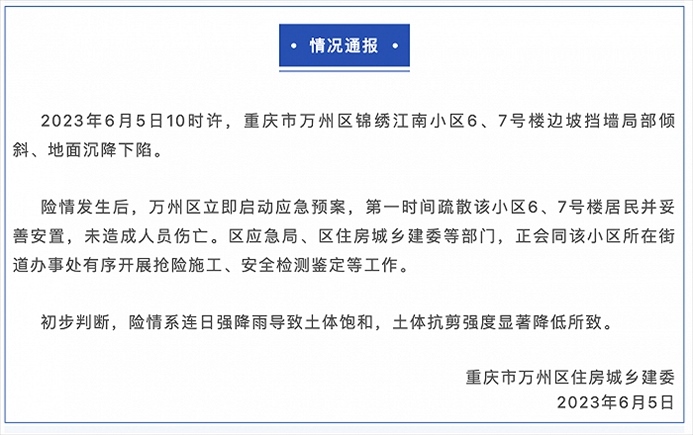 ·重慶萬州區(qū)一小區(qū)地面沉降,官方:系連日強降雨所致,未造成人員傷亡。
