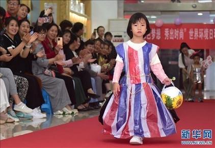 河南省洛陽市澗西區(qū)武漢路街道武漢路社區(qū),一名小朋友在展示環(huán)保服裝。