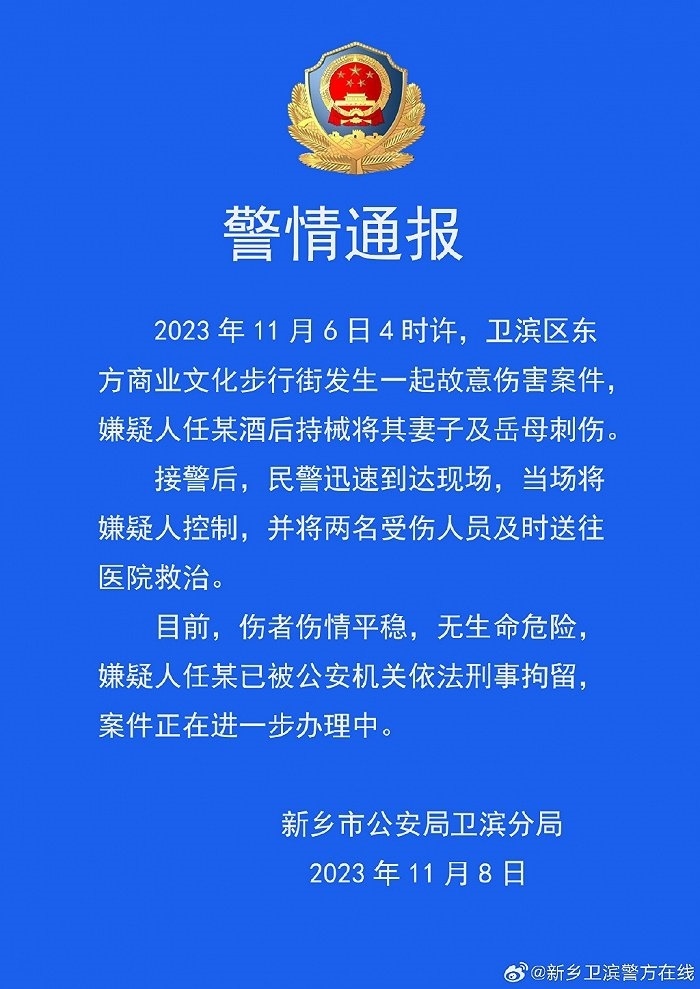 ·河南新鄉(xiāng)警方通報:一男子酒后持械刺傷妻子及岳母,被刑事拘留。
