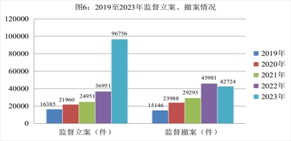 全國檢察機(jī)關(guān)共監(jiān)督立案96756件,同比上升1.6倍。監(jiān)督立案后起訴29974人,同比上升89.7%。作出生效裁判25693人,同比上升82.7%,其中,判處有期徒刑以上刑罰25259人,判處有期徒刑以上刑罰率98.3%,同比增加0.9個(gè)百分點(diǎn)。監(jiān)督撤案42724件,監(jiān)督撤案率100%,同比增加0.1個(gè)百分點(diǎn),呈逐年上升趨勢。