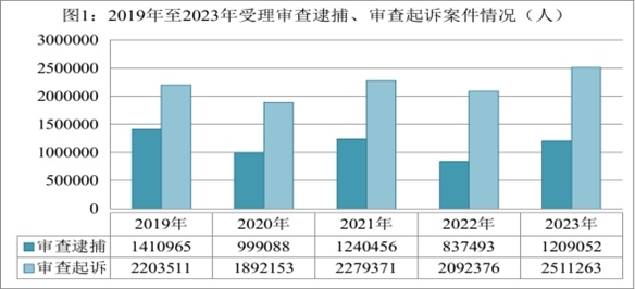 隨著新冠疫情防控轉(zhuǎn)段,我國經(jīng)濟(jì)回升向好,社會(huì)活躍度增加,同時(shí),檢察機(jī)關(guān)與有關(guān)部門一道依法從嚴(yán)懲處電信網(wǎng)絡(luò)詐騙等嚴(yán)重影響人民群眾安全感的犯罪,刑事犯罪案件總量增長。2023年,全國檢察機(jī)關(guān)受理審查逮捕各類犯罪828999件1209052人,同比分別上升49.8%、44.4%。審查后共批準(zhǔn)逮捕72.6萬人,同比上升47.1%;受理審查起訴各類犯罪1786635件2511263人,同比分別上升19.7%、20%。審查后決定起訴168.8萬人,同比上升17.3%。