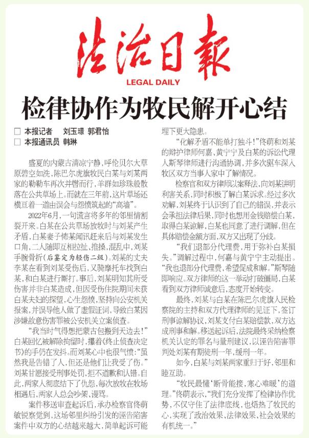 “牧民最懂‘斷骨能接,寒心難暖’的道理?!辟∶缺硎荆拔覀兂浞职l(fā)揮了檢律協(xié)作優(yōu)勢,不僅守住了法律底線,也焐熱了牧民的心,實現了政治效果、法律效果、社會效果的有機統(tǒng)一?!保?span style="text-align: justify;">作者 劉玉璟 郭君怡 韓琳)