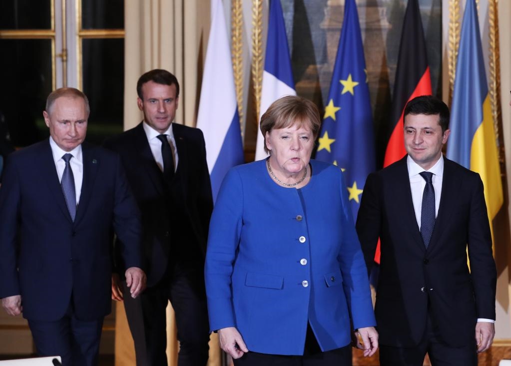 2019年12月9日,在法國巴黎,(從左到右)俄羅斯總統(tǒng)普京、法國總統(tǒng)馬克龍、時(shí)任德國總理默克爾和烏克蘭總統(tǒng)澤連斯基出席“諾曼底模式”四國峰會。(新華社記者高靜攝)