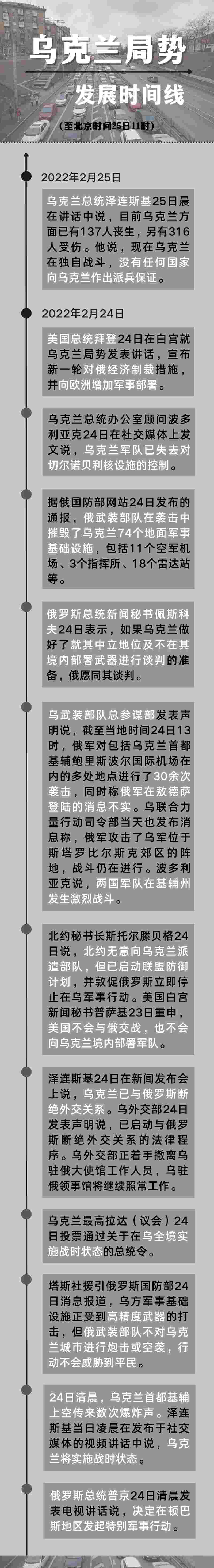 ——烏克蘭總統(tǒng)澤連斯基25日晨在講話中說,目前烏克蘭方面已有137人喪生,另有316人受傷。他說,現在烏克蘭在獨自戰(zhàn)斗,沒有任何國家向烏克蘭作出派兵保證。