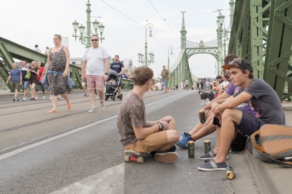 2019年7月21日,人們在匈牙利首都布達(dá)佩斯的自由橋上游玩。新華社發(fā)(弗爾季·奧蒂洛攝)
