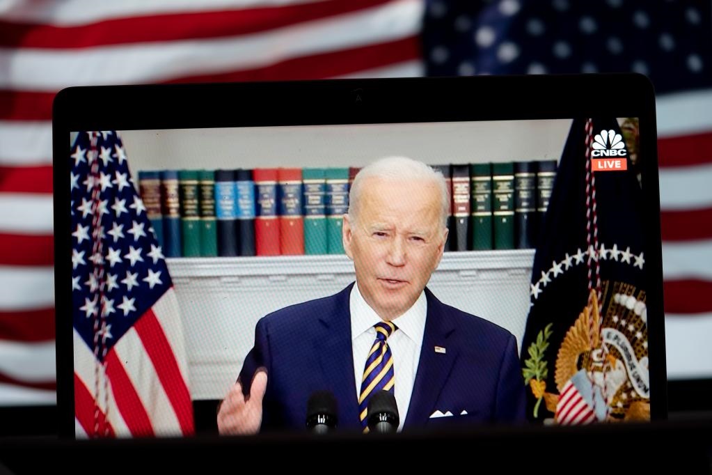 2022年3月8日拍攝的視頻畫面顯示,美國總統(tǒng)拜登在華盛頓白宮發(fā)表講話。拜登當天宣布,美國將對俄實施能源禁運,停止從俄進口石油、天然氣和煤炭。新華社記者劉杰攝