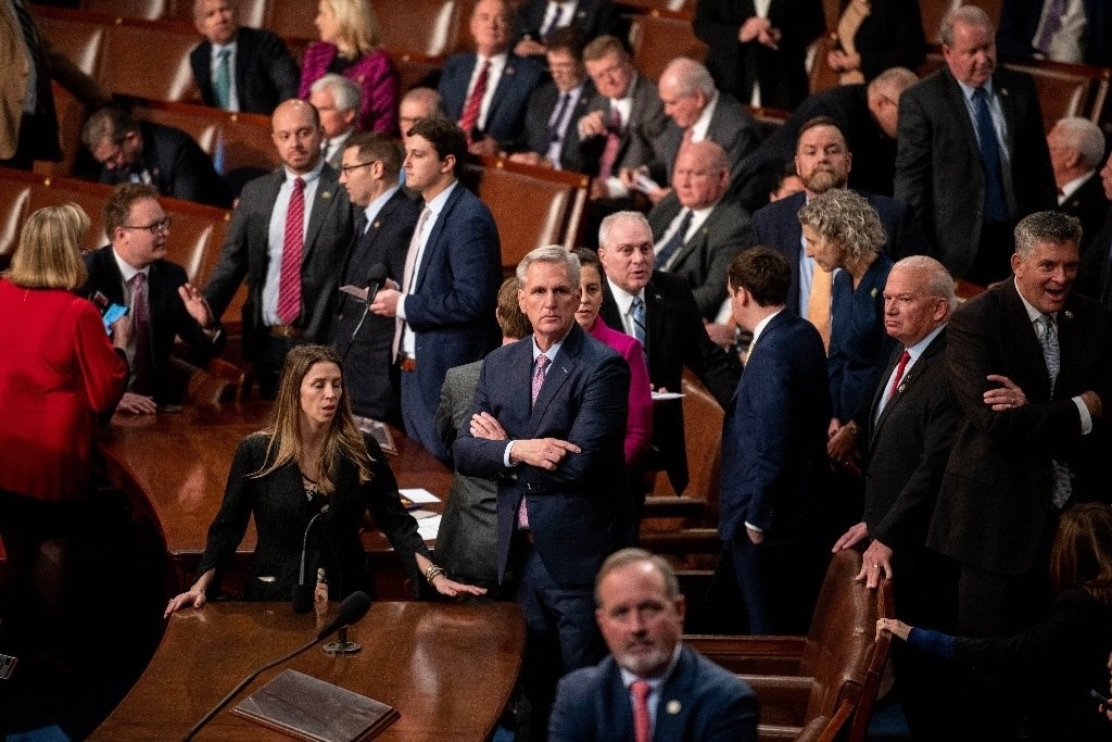 這是1月6日在美國華盛頓國會拍攝的凱文·麥卡錫(中)。經(jīng)過黨內(nèi)激烈爭論達(dá)成利益交換,共和黨眾議員凱文·麥卡錫于7日凌晨在第15輪眾議院議長選舉表決中當(dāng)選議長。(新華社記者劉杰攝)