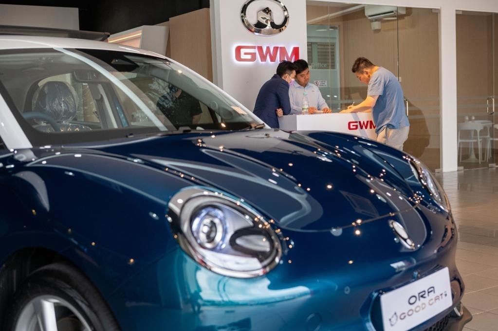 2月17日,在馬來西亞吉隆坡,一名顧客準備試駕中國長城汽車旗下的歐拉好貓新能源汽車。