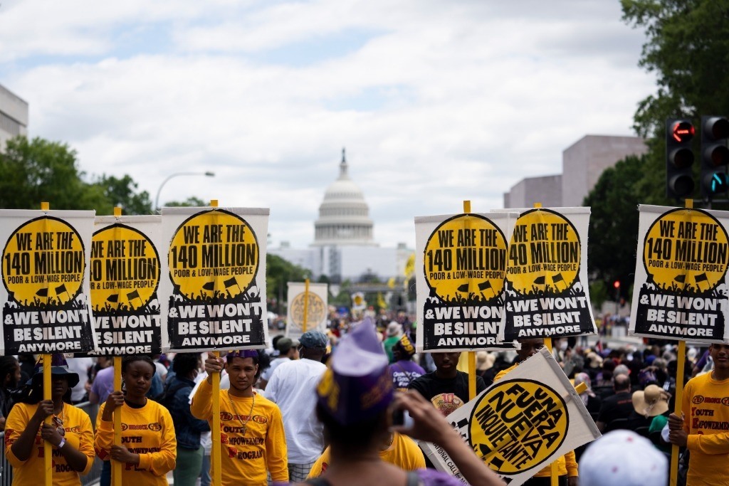 2022年6月18日,來(lái)自美國(guó)全國(guó)各地的數(shù)千民眾在華盛頓國(guó)會(huì)大廈附近舉行集會(huì),抗議美國(guó)根深蒂固的種族歧視以及由此引發(fā)的經(jīng)濟(jì)不公等一系列社會(huì)問(wèn)題。新華社記者劉杰攝