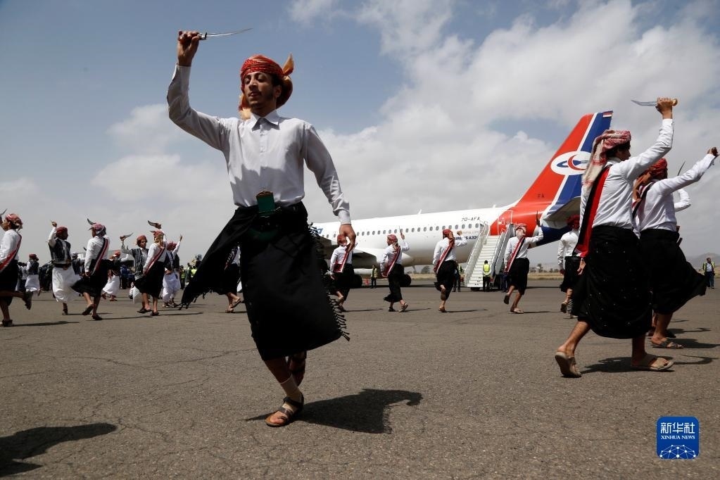 4月15日,在也門薩那機(jī)場,人們?cè)跉g迎戰(zhàn)俘歸來的儀式上跳舞。