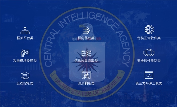 國家病毒應(yīng)急處理中心和360公司通過進(jìn)一步技術(shù)分析發(fā)現(xiàn),盡管CIA的后門程序和攻擊組件大都以無實(shí)體文件的內(nèi)存駐留執(zhí)行的方式運(yùn)行,這使得對相關(guān)樣本的發(fā)現(xiàn)和取證難度極大。即使這樣,聯(lián)合技術(shù)團(tuán)隊(duì)還是成功找到了解決取證難題的有效方法,發(fā)現(xiàn)了CIA所使用的9個(gè)類別的攻擊武器,包括攻擊模塊投遞類、遠(yuǎn)程控制類、信息收集竊取類、第三方開源工具類等。