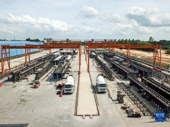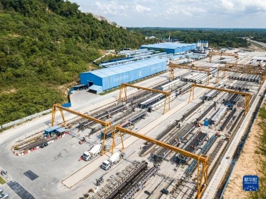 這是4月26日在馬來西亞吉蘭丹州拍攝的馬東鐵項目一分部制梁場(無人機拍攝)。新華社記者 朱煒 攝