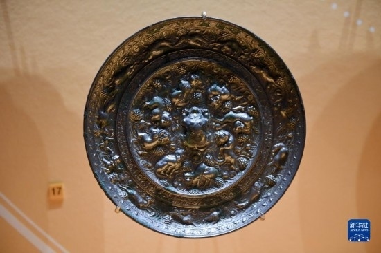 這是在西安博物院展出的唐代瑞獸葡萄紋銅鏡(5月8日攝)。葡萄、苜蓿等農(nóng)作物通過(guò)絲綢之路傳入中國(guó)。