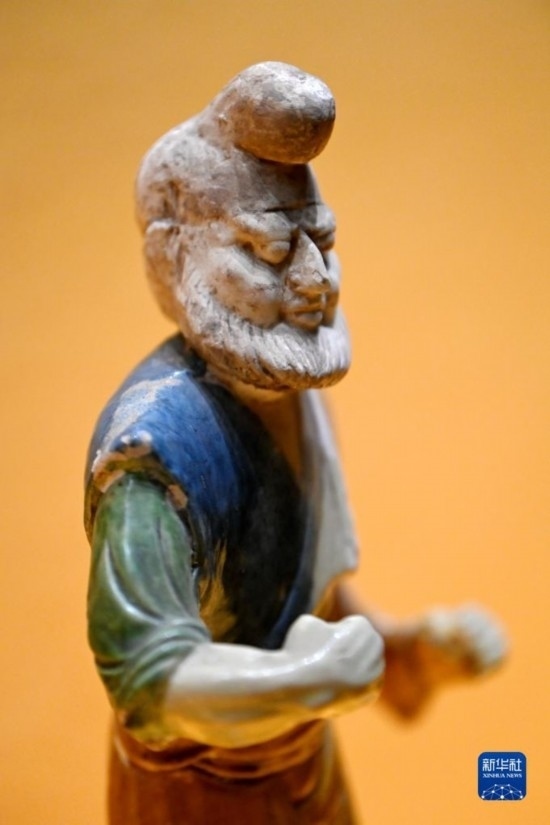 這是在西安博物院展出的唐代三彩胡人牽馬(駝)陶俑(5月8日攝)。唐代的長(zhǎng)安城中居住著大批胡人,胡樂(lè)、胡服風(fēng)靡長(zhǎng)安,經(jīng)考古出土的陶俑中有為數(shù)不少的胡人形象。