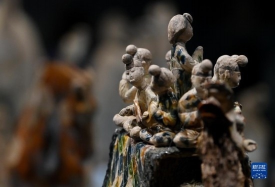 這是在陜西歷史博物館拍攝的唐三彩駱駝?shì)d樂(lè)俑(5月11日攝)。這件唐三彩駱駝?shì)d樂(lè)俑既是唐代文化藝術(shù)、制作工藝發(fā)達(dá)昌盛的重要物證,也見證了絲綢之路上藝術(shù)的交流與融合。