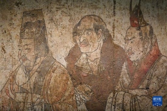 這是在陜西歷史博物館拍攝的唐章懷太子墓《客使圖》(局部)(5月11日攝)?!犊褪箞D》描繪的是唐代外交機(jī)構(gòu)鴻臚寺官員接待外國(guó)使節(jié)的場(chǎng)景。