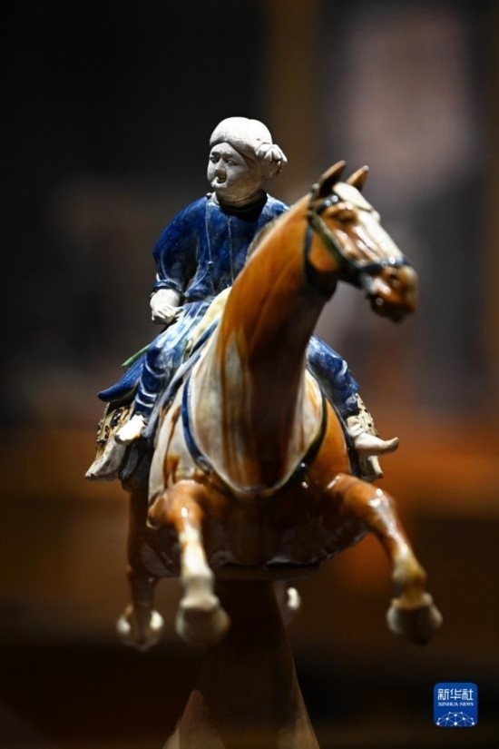 5月8日,游客在西安博物院參觀唐代三彩騰空馬。飛騰的三彩馬上騎有一胡俑,真實(shí)再現(xiàn)了絲綢之路上西域胡人急奔長(zhǎng)安的生動(dòng)形象。