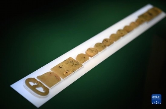 這是在陜西歷史博物館拍攝的骨咄玉帶銙(5月11日攝)?!肮沁汀奔寸孢土_,是位于今塔吉克斯坦和阿富汗之間的中亞小國(guó),史籍記載與唐王朝交往密切。