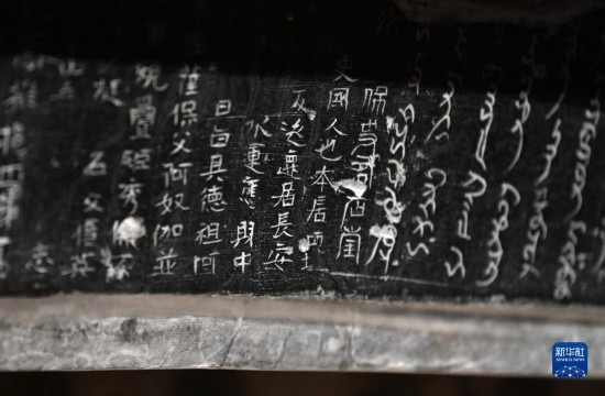 這是在西安博物院展出的史君墓石槨,槨門門楣上用漢文和粟特文刻著墓主墓志(5月8日攝)。墓主史君是北周涼州薩保,粟特人。石槨整體為中國(guó)傳統(tǒng)歇山頂?shù)钐檬浇ㄖ谋诟〉駜?nèi)容和風(fēng)格則帶有鮮明的西域特色。