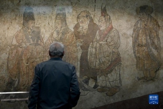 5月11日,游客在陜西歷史博物館內(nèi)觀看唐章懷太子墓《客使圖》?!犊褪箞D》描繪的是唐代外交機(jī)構(gòu)鴻臚寺官員接待外國(guó)使節(jié)的場(chǎng)景。