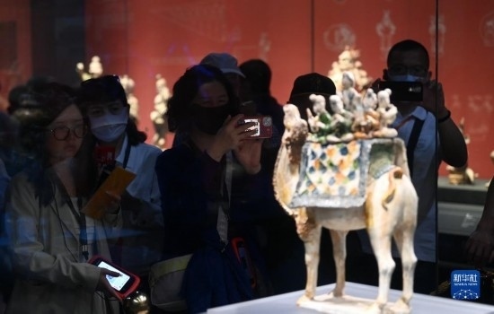 5月11日,游客在陜西歷史博物館參觀唐三彩駱駝?shì)d樂(lè)俑。這件唐三彩駱駝?shì)d樂(lè)俑既是唐代文化藝術(shù)、制作工藝發(fā)達(dá)昌盛的重要物證,也見證了絲綢之路上藝術(shù)的交流與融合。