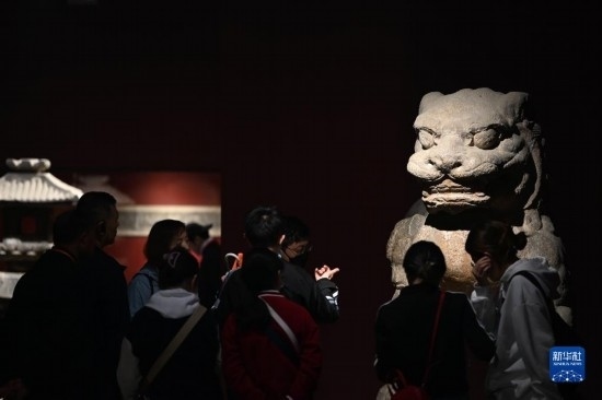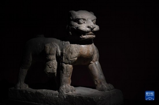 5月9日,游客在西安碑林博物館內(nèi)參觀唐代石獅。古代中國(guó)的獅子多通過(guò)絲綢之路由外國(guó)進(jìn)貢而來(lái)。