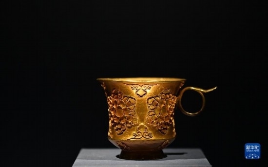 這是在陜西歷史博物館拍攝的掐絲團(tuán)花紋金杯(5月11日攝)。唐代帶把杯除部分器物直接來(lái)自中亞粟特,還有部分屬于唐人仿制粟特風(fēng)格的作品,這些物品都是東西方文明通過(guò)絲綢之路進(jìn)行交流互鑒的的珍貴物證。