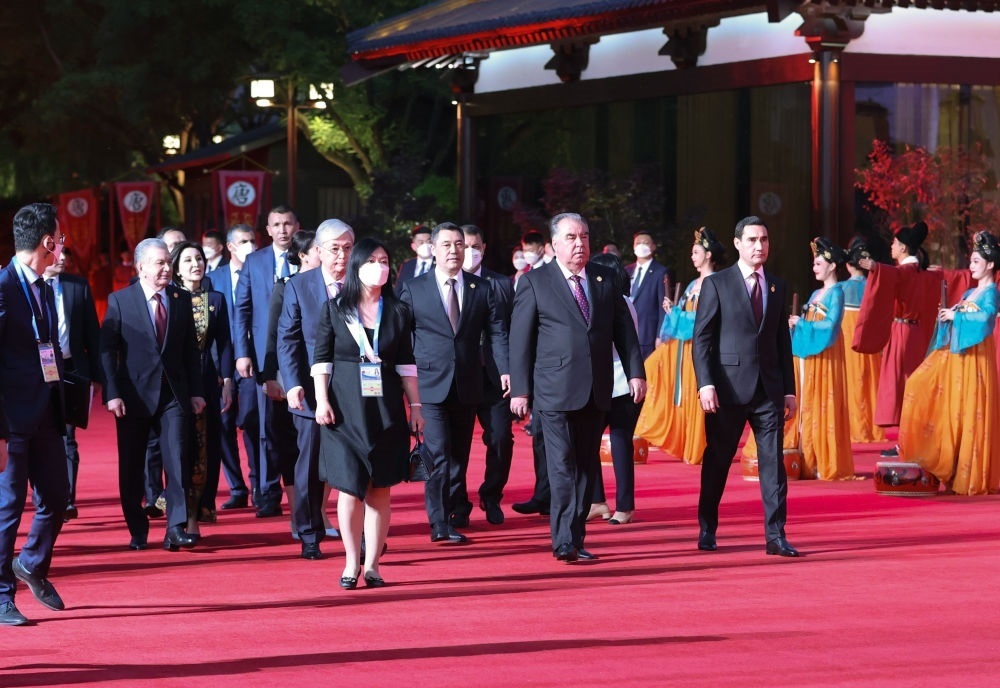 哈薩克斯坦總統(tǒng)托卡耶夫、吉爾吉斯斯坦總統(tǒng)扎帕羅夫和夫人扎帕羅娃、塔吉克斯坦總統(tǒng)拉赫蒙、土庫曼斯坦總統(tǒng)別爾德穆哈梅多夫、烏茲別克斯坦總統(tǒng)米爾濟約耶夫和夫人米爾濟約耶娃抵達紫云樓前。