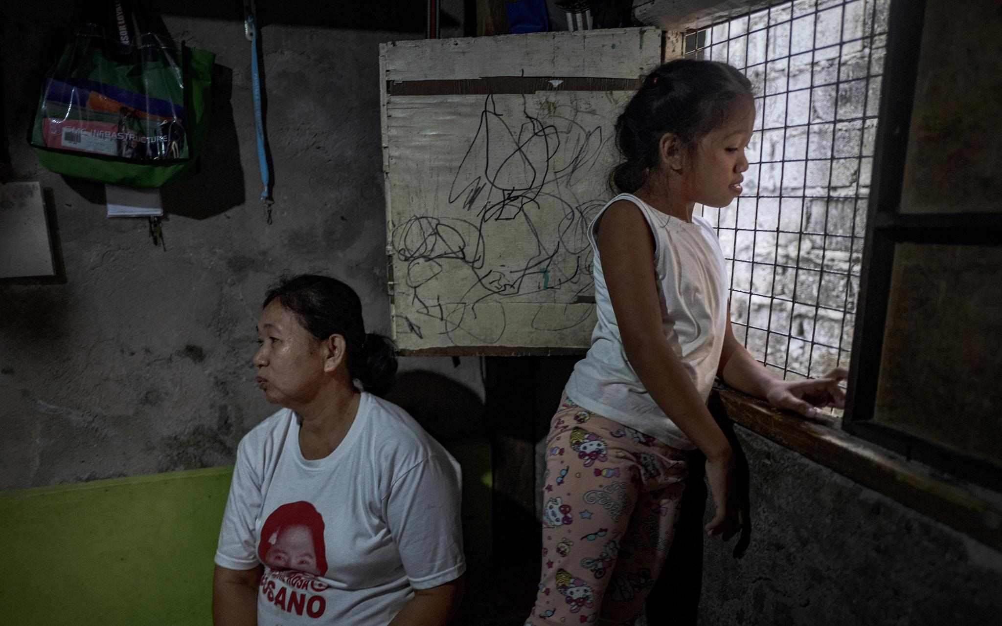 當(dāng)?shù)貢r(shí)間2023年4月15日,菲律賓馬尼拉,奎松市,Corazon Mercado(左)和她的女兒Bea坐在家里。據(jù)Corazon Mercado說(shuō):“我們買不起大瓶或散裝的必需品,我們只能買得起小袋的日常必需品。”