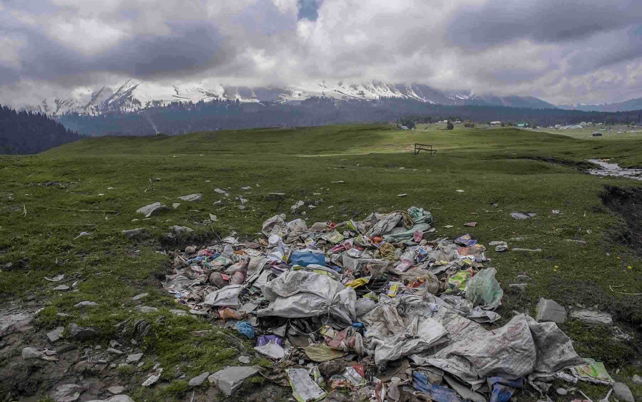 古爾瑪格,著名的滑雪勝地。在夏天,這個(gè)勝地?cái)D滿了避暑的游客并留下了大量的垃圾。垃圾的堆積對(duì)高山生態(tài)造成了嚴(yán)重威脅,也對(duì)冰川溪水造成了嚴(yán)重威脅。盡管指示牌提醒人們禁止攜帶塑料,但對(duì)攜帶食物和水沒(méi)有限制。環(huán)保人士警告說(shuō),古爾瑪格及其周邊地區(qū)的到處都是被丟棄的塑料垃圾。