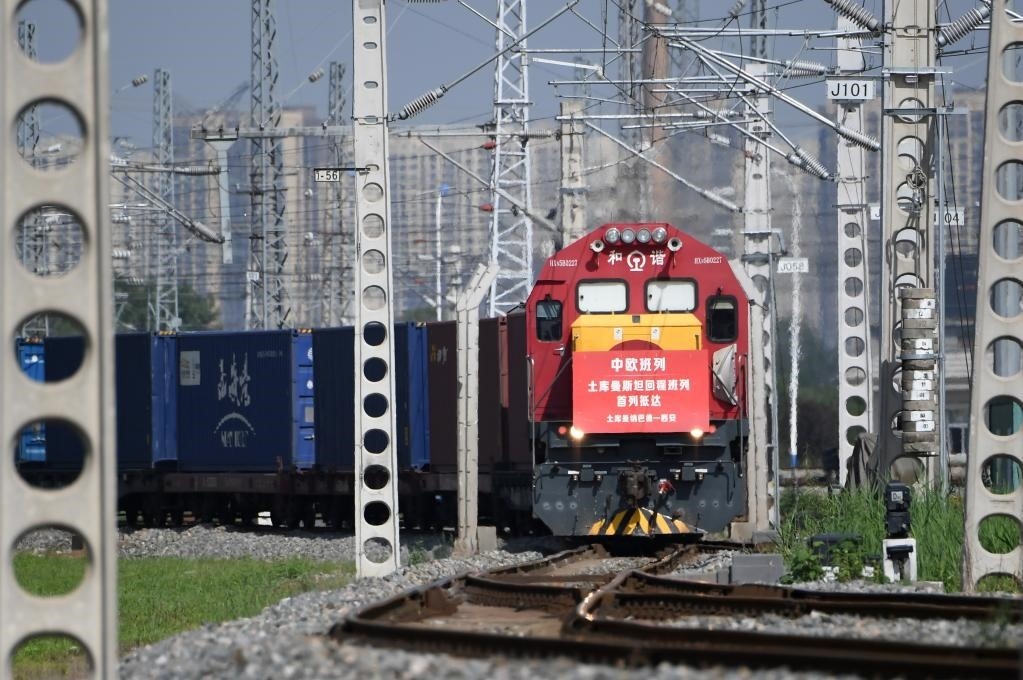 滿載土庫(kù)曼斯坦甘草中藥材原料的中歐班列回程列車(chē)抵達(dá)西安國(guó)際港站(2022年8月31日攝,無(wú)人機(jī)照片)。 新華社記者李一博攝