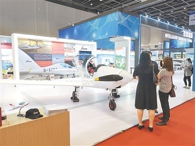 參觀者在展館中央的智能制造展區(qū)了解捷克鯊魚飛機。
