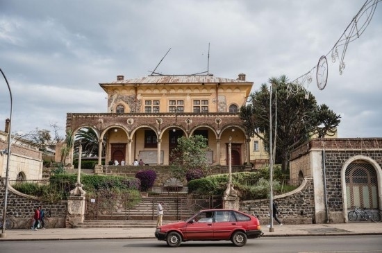 一輛汽車(chē)從厄立特里亞首都阿斯馬拉的阿斯馬拉歌劇院前駛過(guò)。