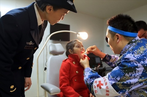 2019年12月9日,在中國(guó)海軍“和平方舟”號(hào)醫(yī)院船上,口腔科醫(yī)生給孟加拉國(guó)的9歲女孩沁做檢查。新華社發(fā)(吳煒權(quán) 攝)