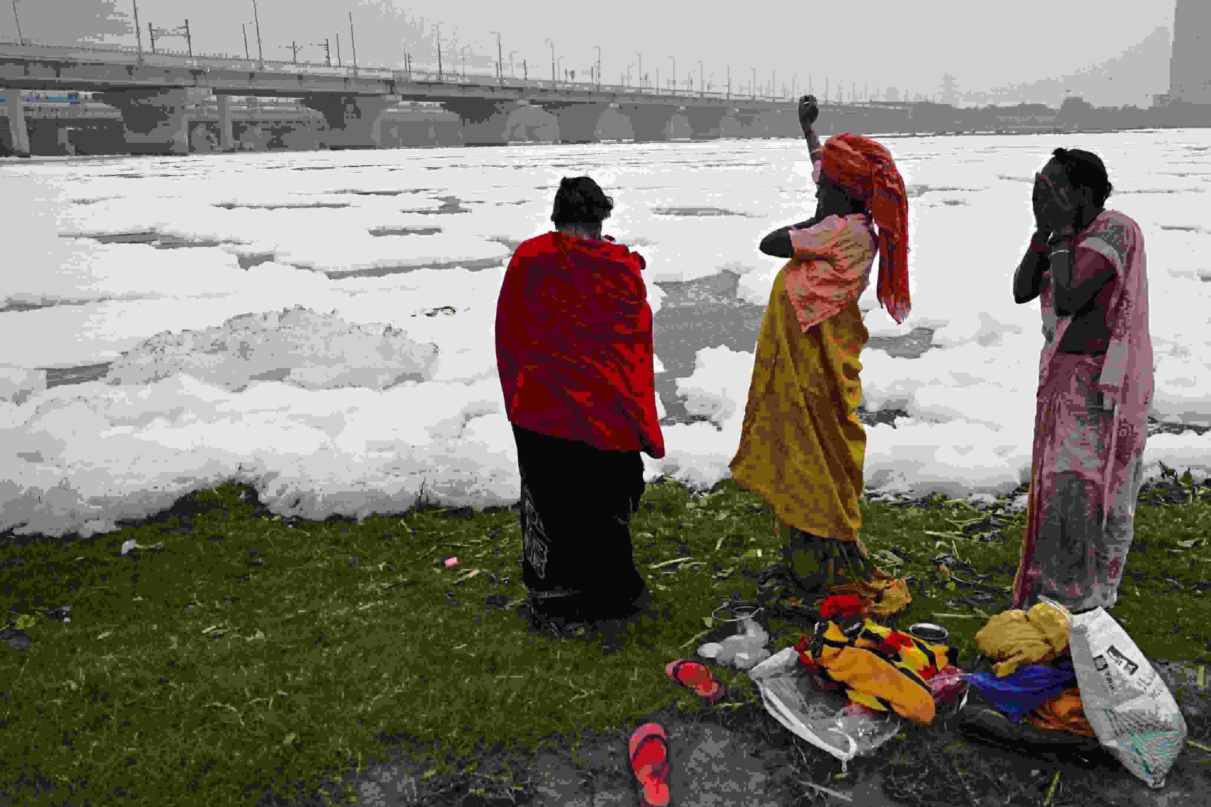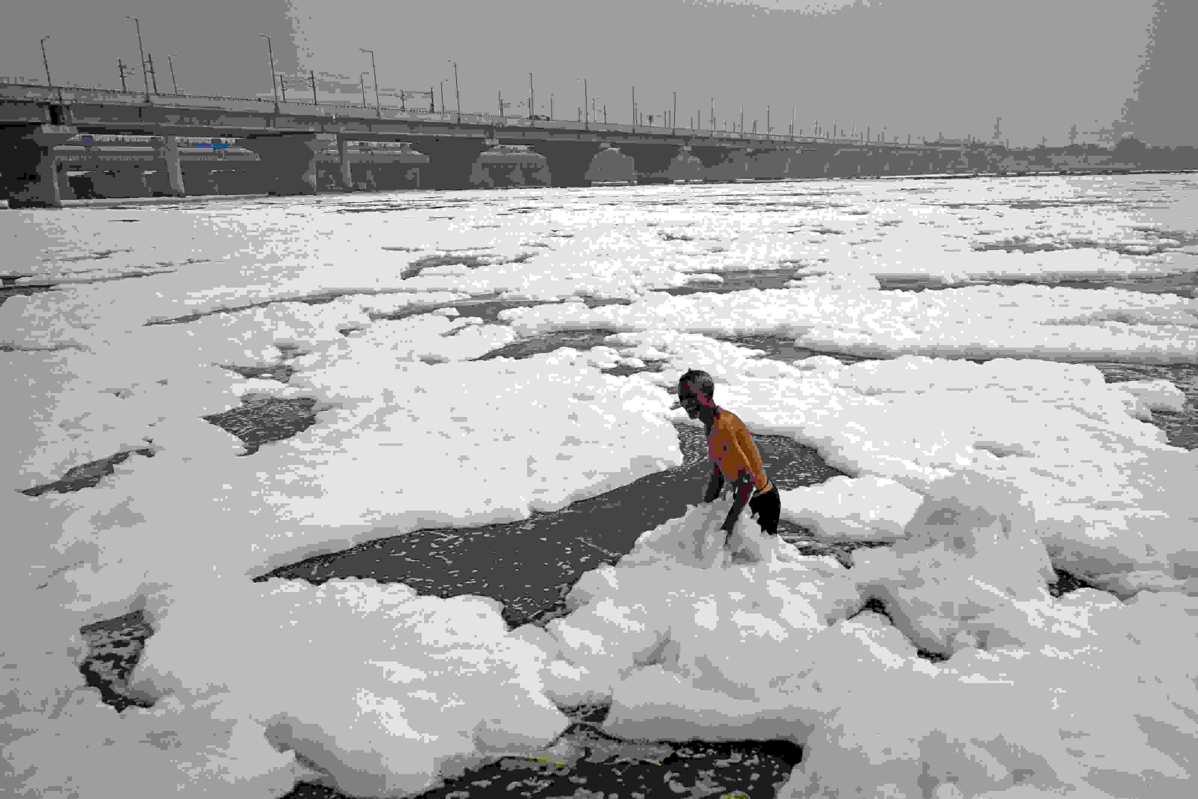 當(dāng)?shù)貢r(shí)間2023年6月4日,印度新德里,世界環(huán)境日前夕,人們?cè)诔錆M有毒泡沫的亞穆納河中沐浴。 視覺(jué)中國(guó)