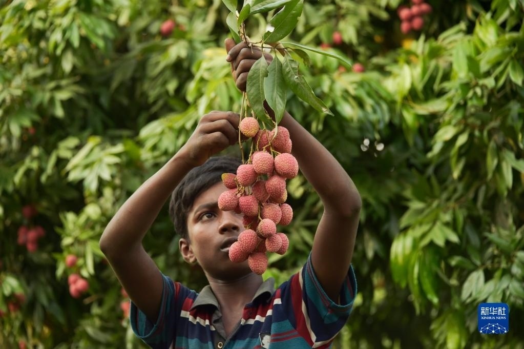 6月4日,一名男孩在孟加拉國迪納杰布爾的果園里采摘荔枝。新華社發(fā)