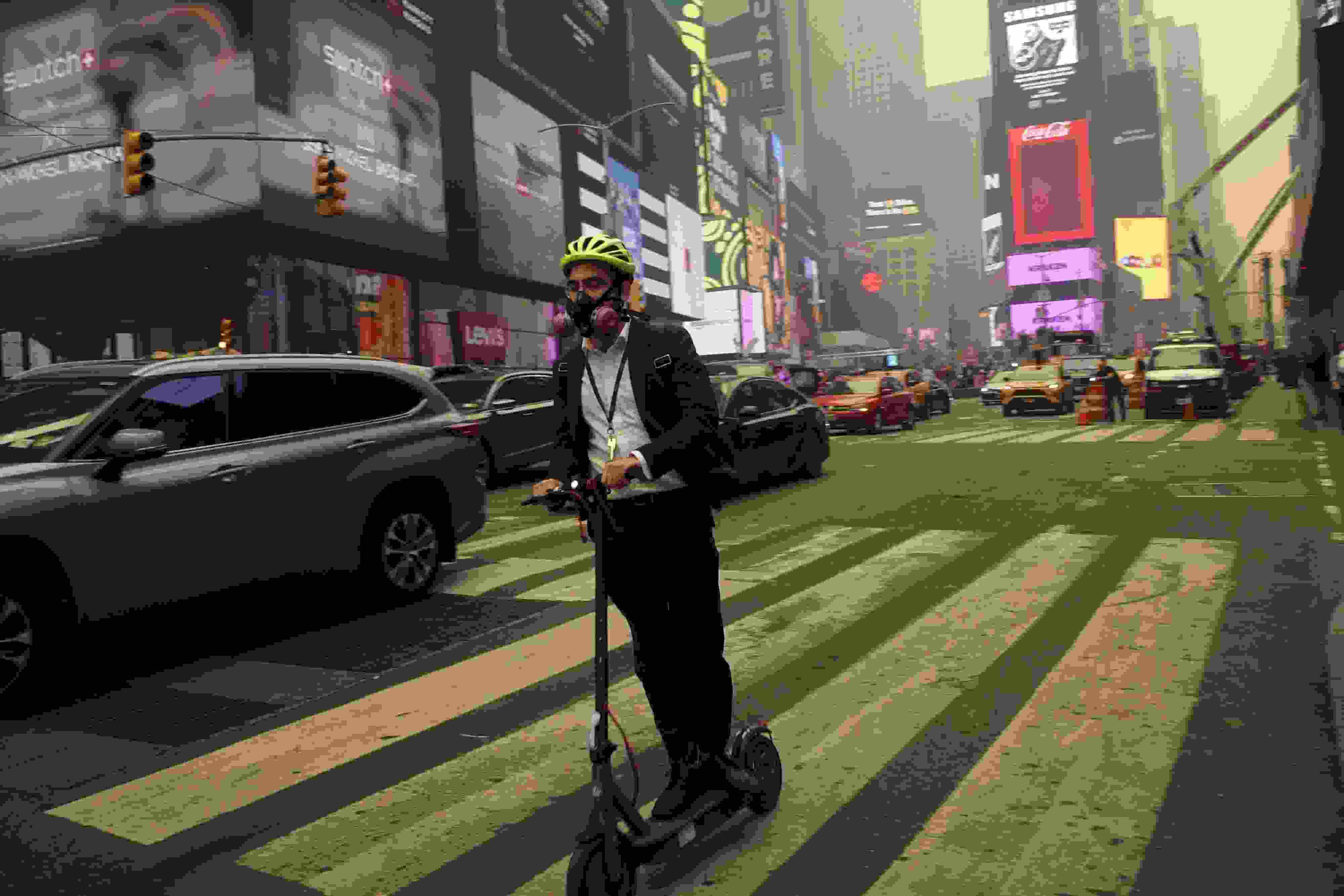 當?shù)貢r間6月7日,美國紐約時報廣場的一位騎行者佩戴著呼吸過濾器。近日,加拿大野火產(chǎn)生的煙霧蔓延至美國,紐約市出現(xiàn)霧霾,戶外民眾嚴密防護。 視覺中國