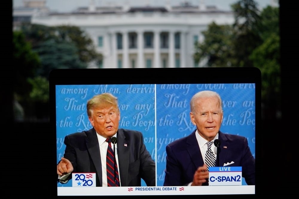 這張2020年9月29日在美國(guó)弗吉尼亞州阿靈頓拍攝的視頻畫面顯示,時(shí)任美國(guó)總統(tǒng)特朗普(左)與美國(guó)民主黨總統(tǒng)候選人拜登在俄亥俄州克利夫蘭市參加2020年美國(guó)總統(tǒng)候選人首場(chǎng)電視辯論。新華社記者劉杰攝