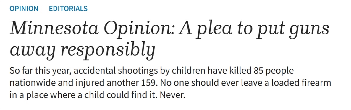 報(bào)道指出,這樣的數(shù)據(jù)駭人聽聞,由于成年槍支擁有者的疏忽大意,太多孩子的童年被迫縮短,幸存下來的人的生活也不可挽回地遭到破壞。任何人都不應(yīng)該把上了膛的槍支留在兒童能夠找到的地方,絕對(duì)不可以。